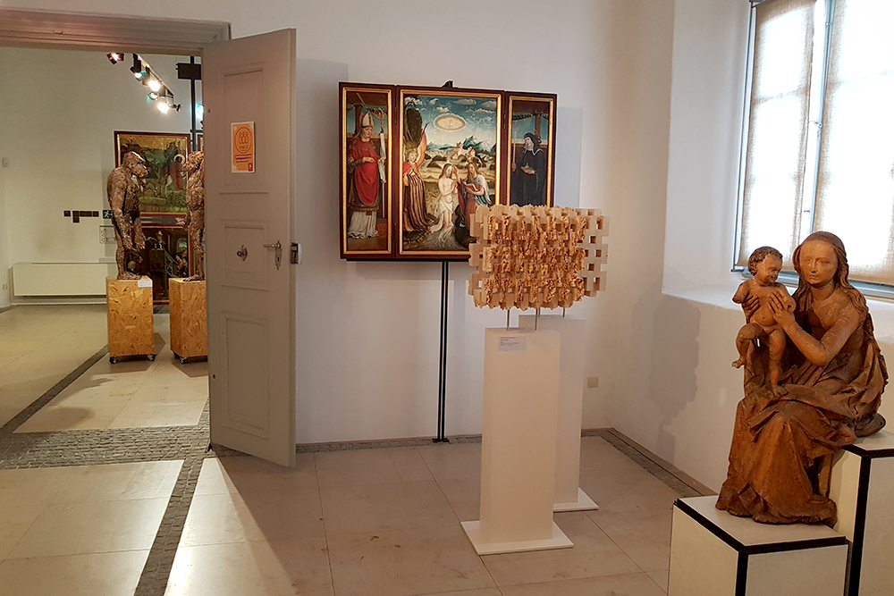 Die Aufstellung mit versetzter Sichtachse verstärkt durch die entstehenden „langen Seiten“ mit gebrochener bzw. glatter Oberfläche die Wirkung und